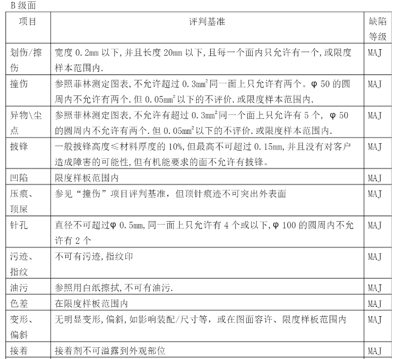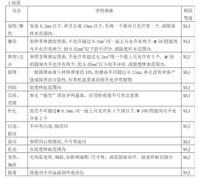 五金沖壓件等級要求一般分為三級,分別按A級、B級、C級下面三張圖分別是五金沖壓件的檢測項目及三級檢測要求。